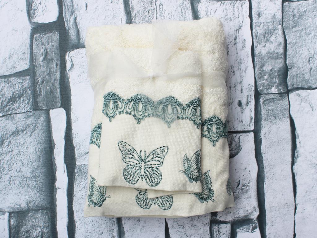 Ürün Adı: "Çeyiz Diyarı Butterfly Nakışlı 2 Li Havlu Takımı Beyaz Turkuaz"