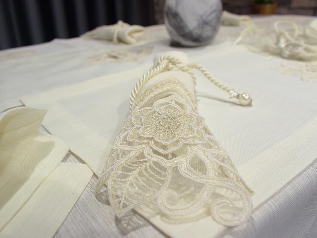 Ürün Adı: Çeyiz Diyarı | Fransız Dantelli El İşi Menekşe 34 Parça Krem Amerikan Servis Seti
