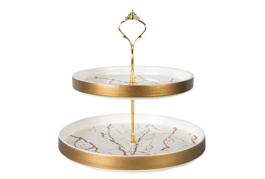Teslimat ve Boyutlar: 1x Dekonaz | 2 Katlı Mermer Desenli Etajer Servis Tabağı | Beyaz & Altın