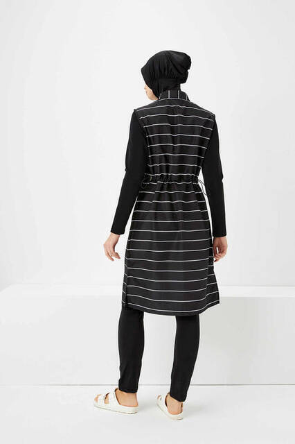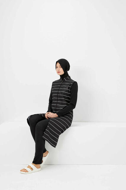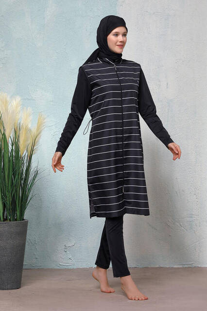 • Siyah rengin hakim olduğu, beyaz çizgiler ile hareketlendirilmiş tam kapalı tesettür mayo.