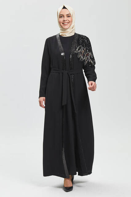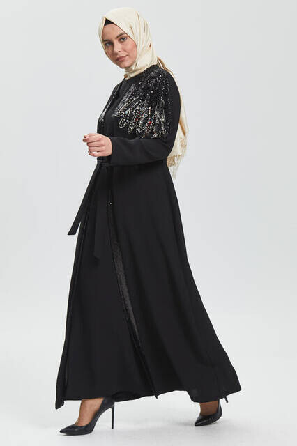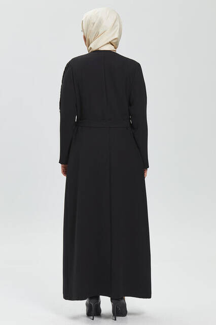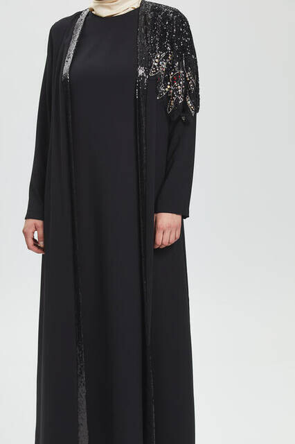 Derin Siyah Tek Omuz İşlemeli Ferace 8021-20