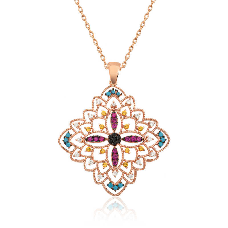 Renkli zirkon taşlar ile süslenmiş etnik desenli madalyon kolye, şık ve ışıltıyı sevenler için tasarlandı. Günün her anında severek kullanabileceğiniz, herkesin beğenisini toplayabilecek ve göz kamaştırabilecek bir üründür. Gümüş etnik desenli madalyon bayan kolye 925 ayar gümüşten imal edilmiştir. Bu kolye üzerine rose altın kaplama yapılmıştır. Rose altın kaplama yapılan ürünler parlaklığını uzun süre muhafaza eder ve gümüşü bakır rengine dönüştürür. Üzerinde bulunan taşlar zirkon'dur. Tüm gümüş bayan kolye modellerinde olduğu gibi gümüş etnik desenli madalyon bayan kolye modeli de el emeği ile üretilmiştir. Gümüş ve değerli taşlar nedeniyle belirtilen ortalama ürün ağırlığında ± %10 sapma olabilmektedir.Ürünlerimizin tamamı el emeği ile üretilmiştir.
