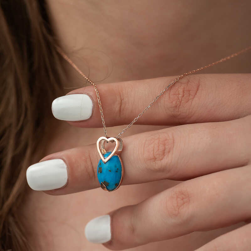 Gümüş turkuaz taşla süslenmiş kalpli bayan kolye, severek kullanabileceğiniz ve sevdiklerinize hediye edebileceğiniz harika bir modeldir. Gümüş bayan kolye 925 ayar gümüşten imal edilmiştir. Gümüş üzerine rose kaplama yapılmıştır. Rose kaplama yapılan gümüş bayan kolye modelleri parlaklığını uzun süre muhafaza eder, oksitlenmesi gecikir. Gümüş olan zincir boyu ortalama 45 cm'dir. Üzerinde bulunan taş turkuazdır. Tüm gümüş bayan kolye modellerimizde olduğu gibi gümüş turkuaz taşlı kalp detaylı bayan kolye modeli de el emeği ile üretilmiştir. Gümüş ve değerli taşlar nedeniyle ürün ağırlığında ± %10 sapma olabilmektedir.