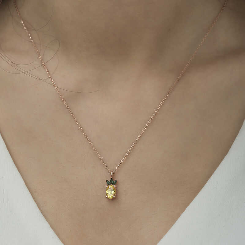 Yaz sezonunun en çok tercih edilen aksesuarları, renkli meyve konseptiyle favorileriniz arasında yer alacak. Meyve konsepti aksesuarlar yazın çok konuşulan kolyeleri olacak ve günlük stilinize renk katacak. Bu şık ananas figür kolye; doğum günü hediyesi, sevgililer günü hediyesi veya özel günlerde tercih edilebilecek mükemmel bir seçenektir. Gümüş zirkon taşlı ananas figür meyve kolye 925 ayar gümüşten imal edilmiştir. Bu kolye üzerine rose altın kaplama yapılmıştır. Rose altın kaplama yapılan ürünler parlaklığını uzun süre muhafaza eder, oksitlenmesini geciktirir. Tüm gümüş bayan kolye modellerinde olduğu gibi gümüş ananas figürlü meyve kolye modeli de el emeği ile üretilmiştir. Gümüş ve değerli taşlar nedeniyle belirtilen ortalama ürün ağırlığında ± %10 sapma olabilmektedir.