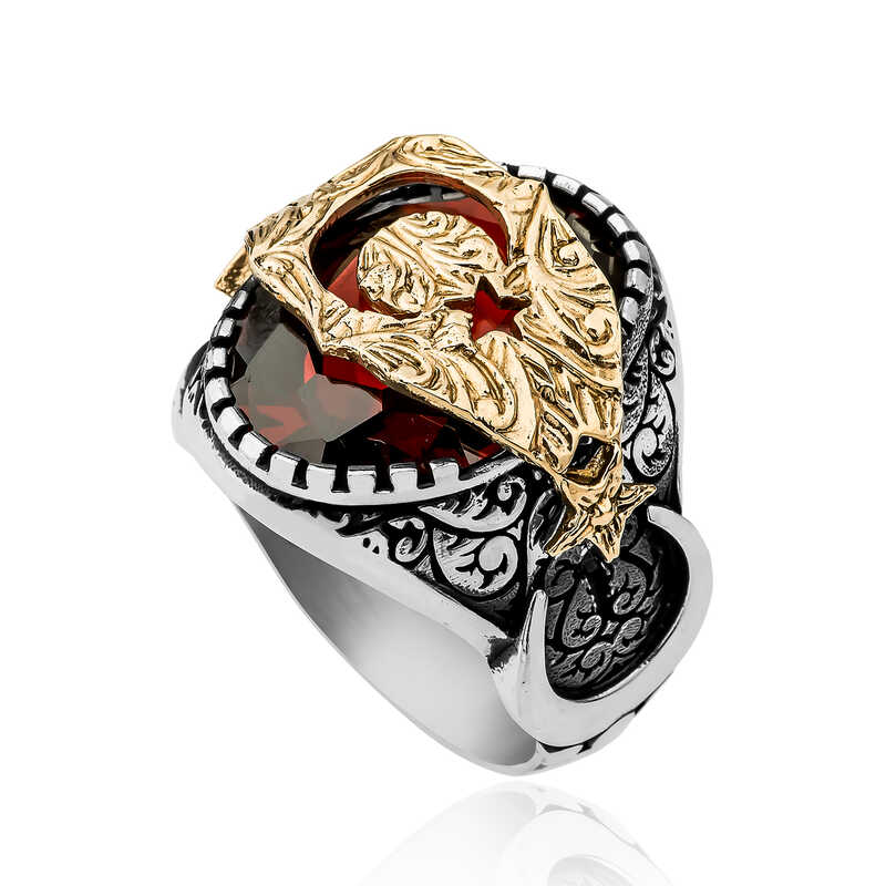 Hilal ve yıldız ya da ay-yıldız; hilal ve hilalin açık ucunda yer alan bir yıldız şeklinden oluşan antik sembol. Bu sembolün kullanıldığı bayraklara çoğunlukla Akdeniz civarında, Orta Doğu ve Orta Asya'da rastlanır. Günümüzde çoğunlukla İslam ülkelerinin bayraklarında kullanılan bir sembol olarak bilinmektedir. Ay-Yıldız simgesi, Türk Bayrağı dahil bir çok bayrakta yer almaktadır. Ay ya da Hilâl, İslâm dini ile özdeşleşmesine rağmen, İslâm öncesi dönemlerde de kullanılmış; Ay-Yıldız ve Güneş motifleri Amerika, Avrupa, Anadolu, Ortadoğu ve Orta Asya panteonunda tarih boyunca yer almıştır. Orta Asya’da İÖ. 5000’lere ait kaya resimlerinden başlayıp daha sonraki şaman davullarında da benzer şekilde tasvir edilen Ay-Yıldız ve Güneş motifleri, Asyalı Türk-Moğol halklarının evren tasarımı hakkında bilgiler sunar. Fakat Ay ile Yıldız’ın birlikte tasvir edildiği ilk belgeler Mezopotamya’da bugünkü Güney Irak’taki Sümer şehirlerinde ortaya çıkmıştır. Sümer dili Türkçe’ye oldukça yakın bir dildi. İnançları da Türkler’e büyük ölçüde benzer bir yapıdaydı. Sümer Ay Tanrısı “Nana- Suen” ve Güneş Tanrısı “Utu” veya Tanrıça İnana’nın sembolleri bir arada gösterilerek ilk Hilâl- Yıldız ikilemesi yapılmış oldu. Bu motif bazen taş kabartmalarda, bazen mühürlerde bazen de kil tabletlerde işlenmiş ve günümüze kadar ulaşmıştır. Tarihten esinlenerek oluşturulan kırmızı fasetli taşlı ay yıldız erkek yüzüğü; kendinize ya da sevdiklerinize doğum gününde, babalar gününde ve özel günlerde hediye edebilirsiniz. Bu şık erkek yüzük 925 ayar gümüşten imal edilmiştir. Gümüş üzerine oksit kaplama, taşın üst kısmındaki ay yıldız kısmına ise altın kaplama yapılmıştır. Oksit kaplama yapılan yüzük otantik bir görünüme sahiptir. Tüm erkek yüzüklerde olduğu gibi gümüş kırmızı fasetli taşlı ay yıldız erkek yüzük de el emeği ile üretilmiştir. Gümüş ve değerli taşlar nedeniyle belirtilen ortalama ürün ağırlığında ± %10 sapma olabilmektedir.