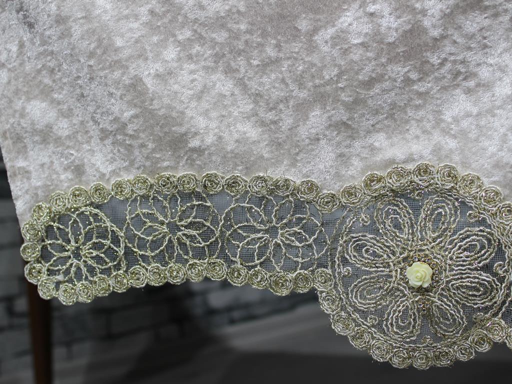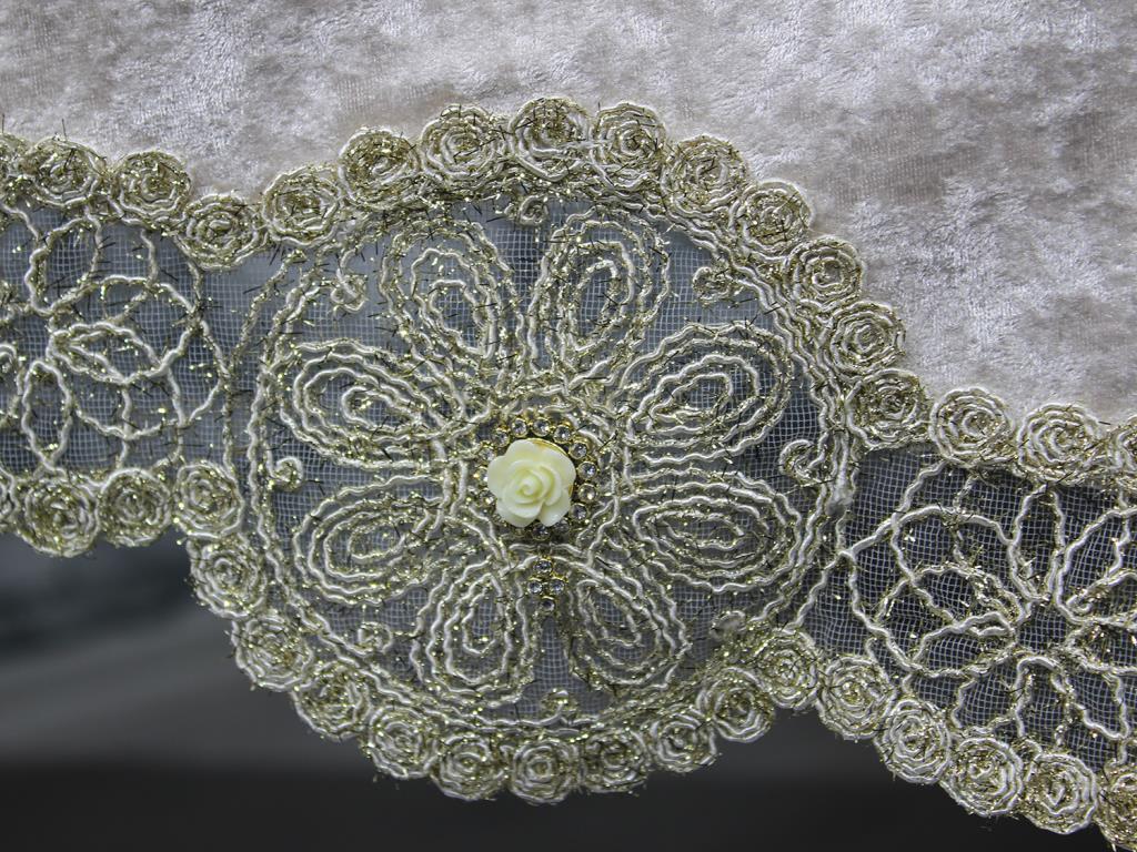 Kadife kumaş üzerine fransız güpürlü ile şık bir tasarım oluşturulmuştur.