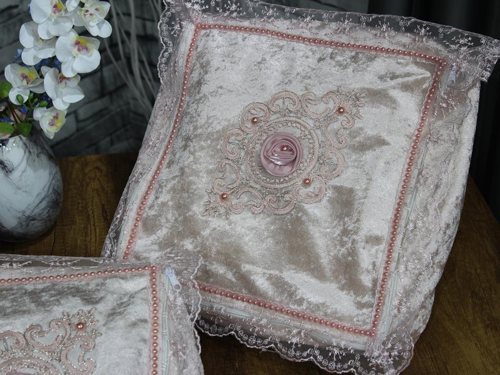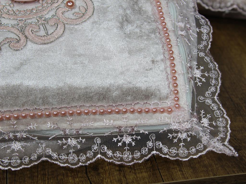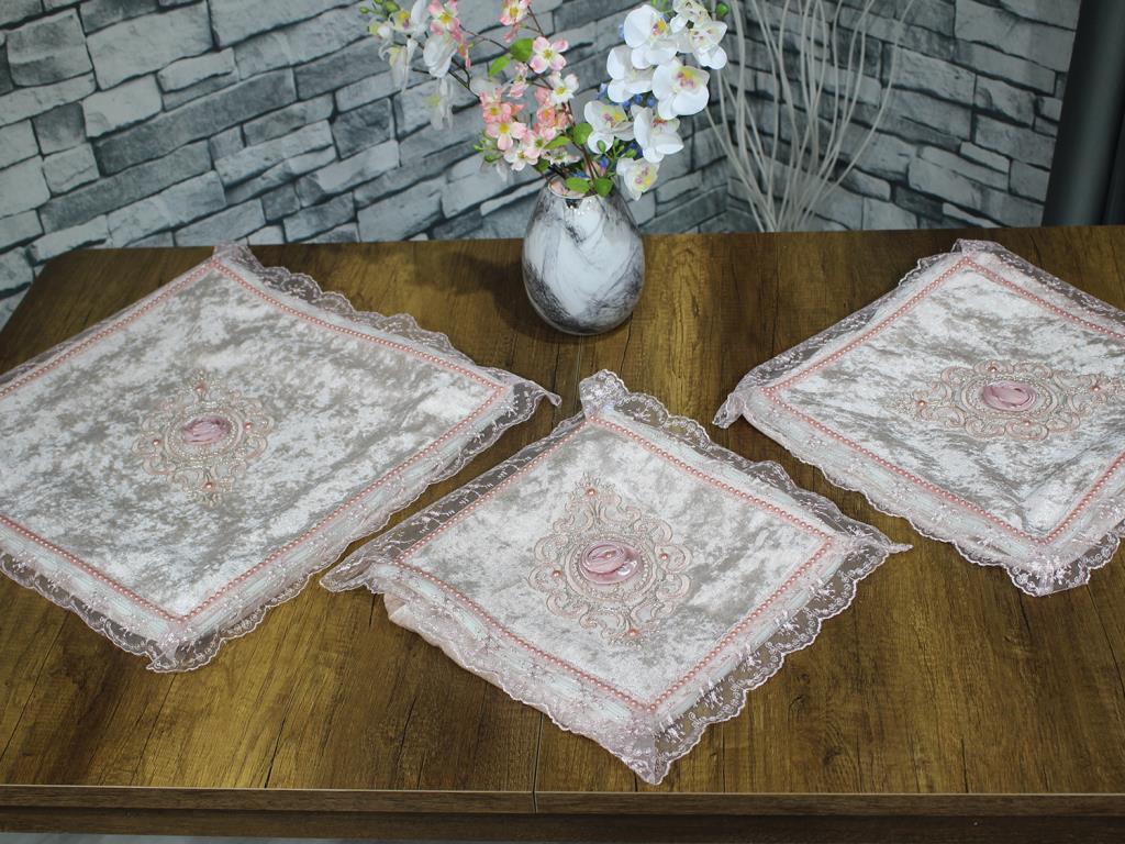 Ürün Adı: "Çeyiz Diyarı Fransız Güpürlü Nazende Kadife 3 Lü Bohça Seti Pudra"