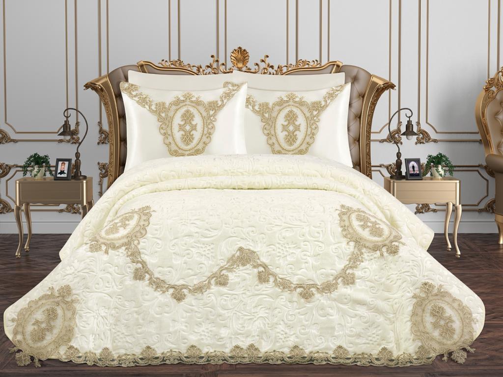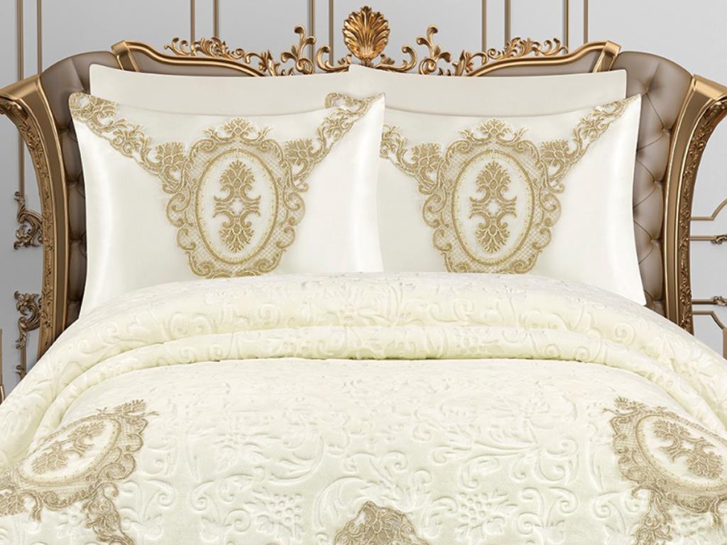 Eylül Fransız Güpürlü Battaniye Takımı, dantel detaylara sahiptir. Göz alıcı tasarımı ile evinize şık bir görünüm sunar.