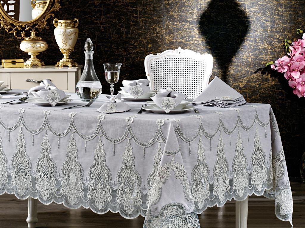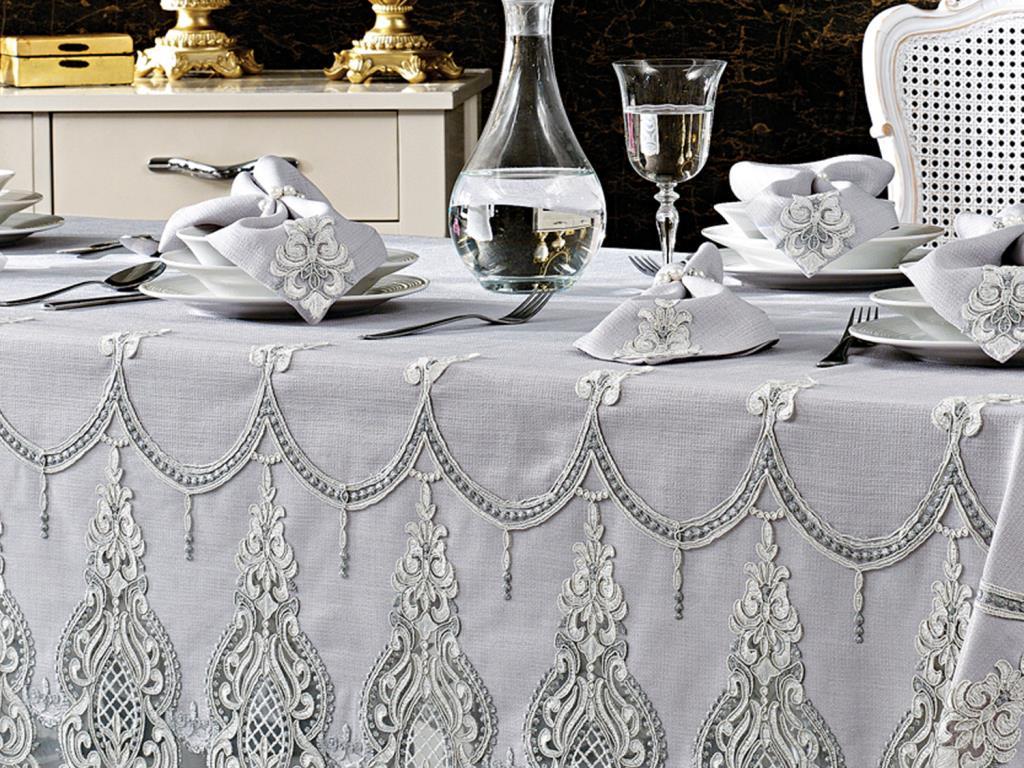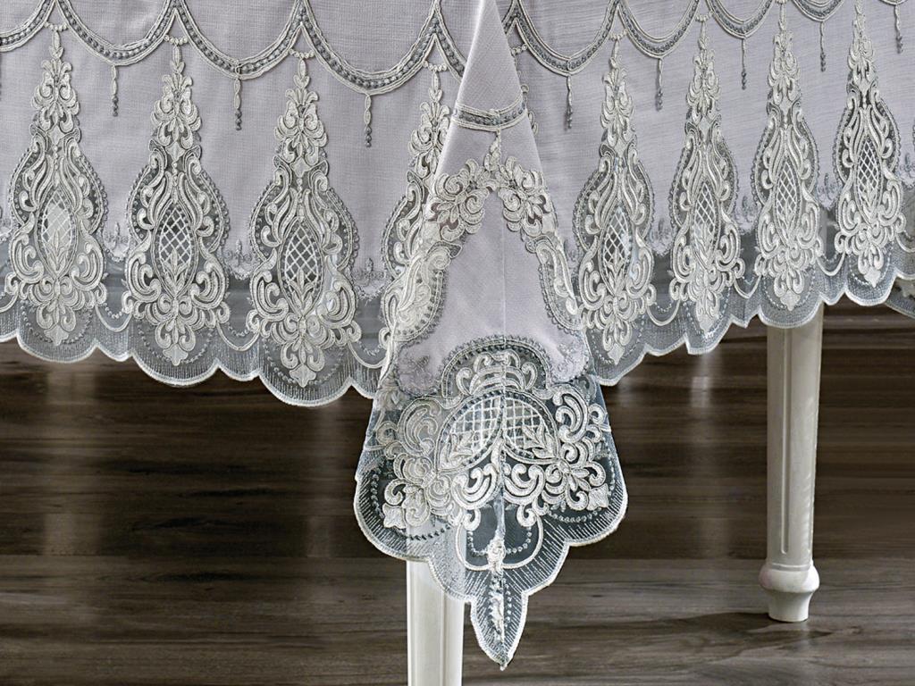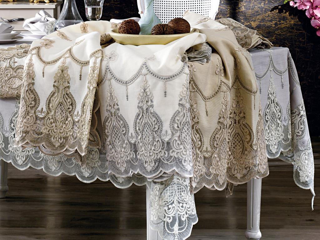 Masa Örtüsünün Dört Kenarı ve Runner uçları Fransız Taşlı Güpürleri ile süslenerek özel bir tasarım oluşturulmuştur.