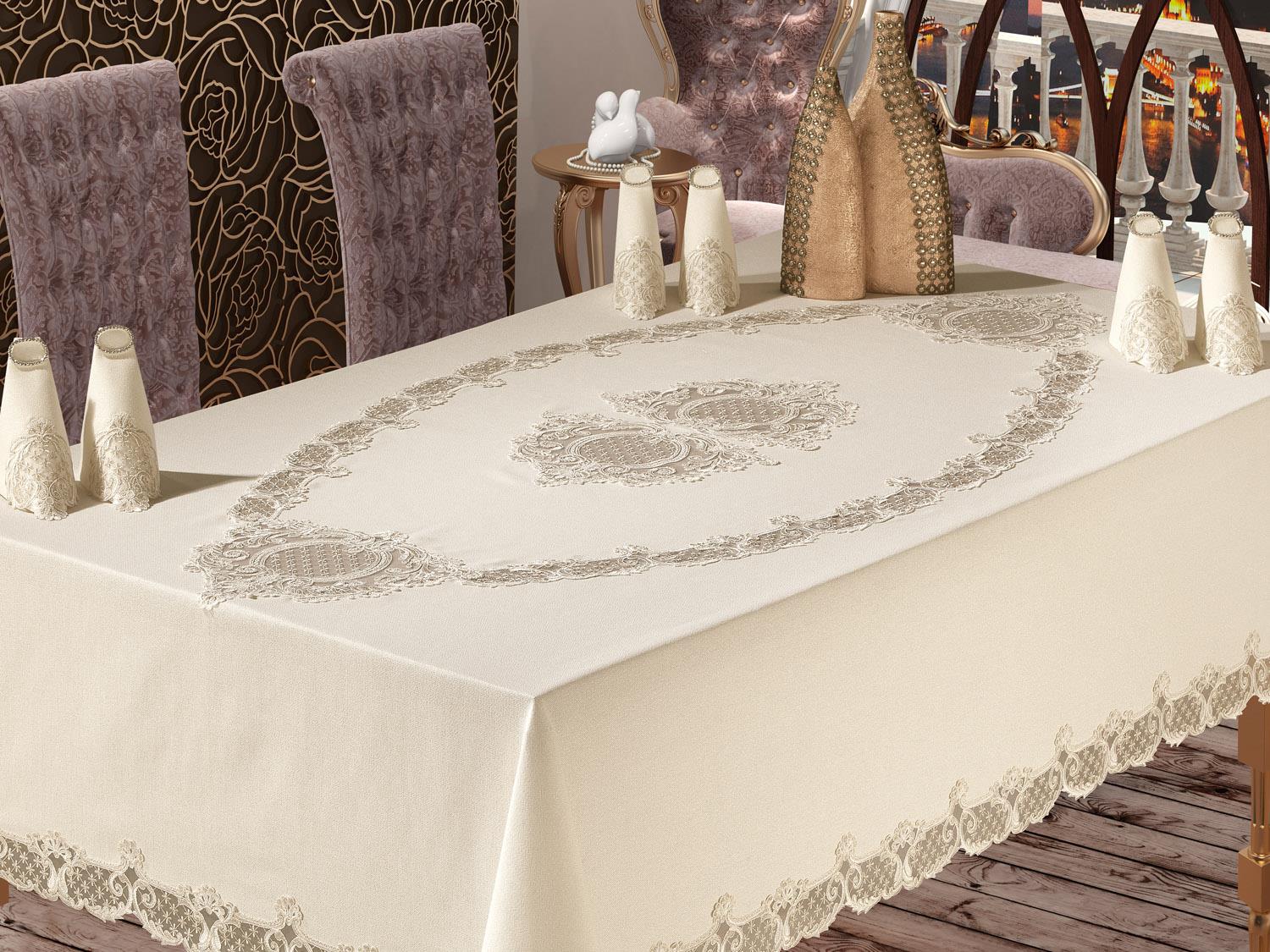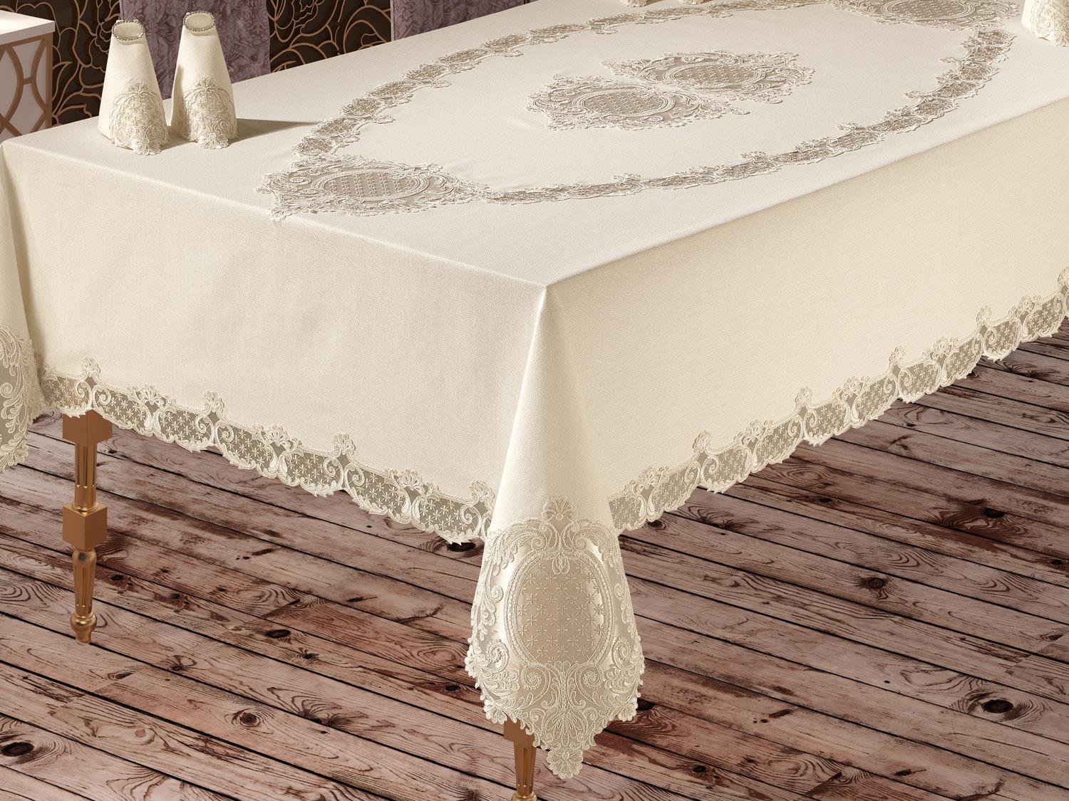 Fransız dantelleri masa örtüsü 4 kenarında uygulanarak şık bir tasarım oluşturulmuştur.