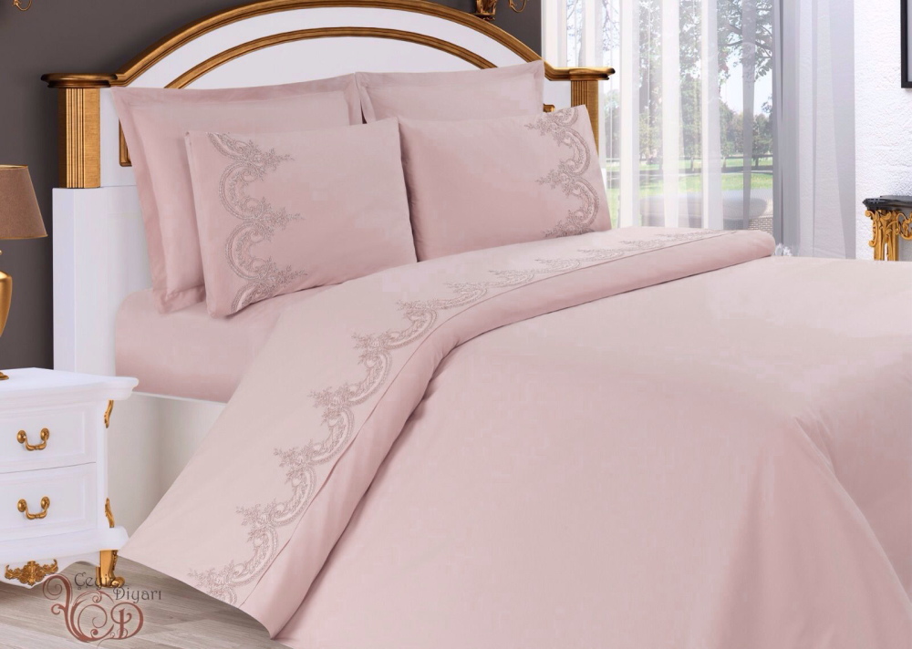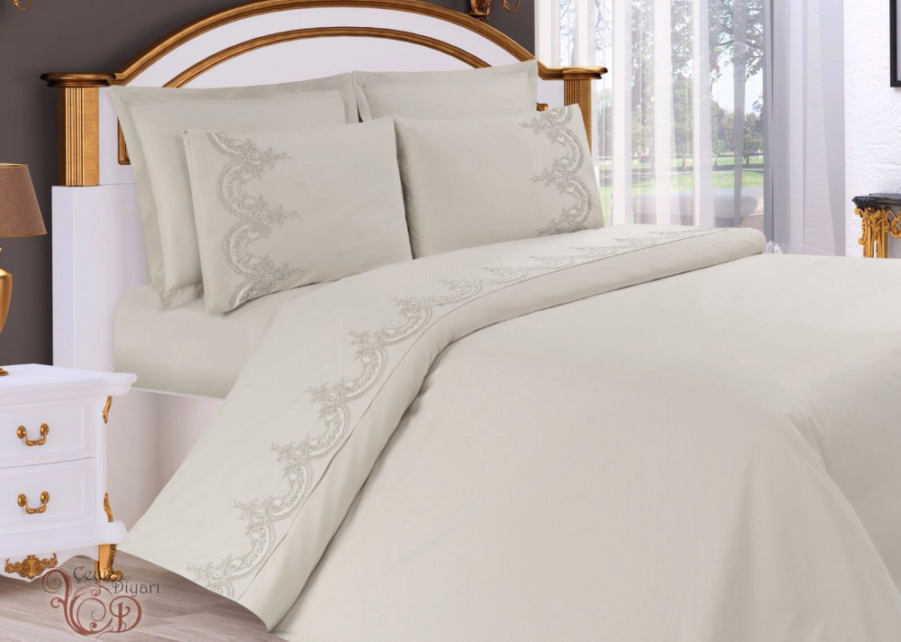 100 Pamuk Kumaştan üretilmiştir. Nevresim ağzına fransız güpürü dikilmiş özelbir tasarım oluşturulmuştur.