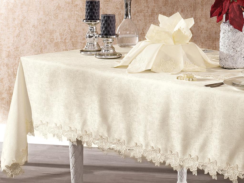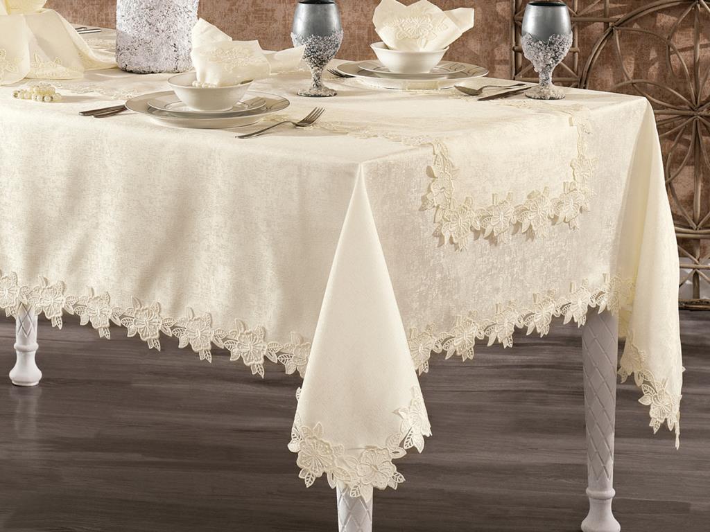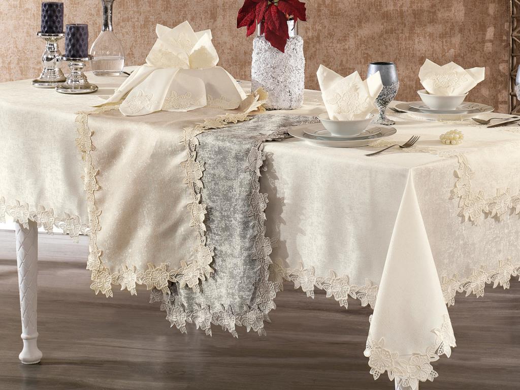 Masa Örtüsünün Dört Kenarı ve Runner uçları Fransız Taşlı Güpürleri ile süslenerek özel bir tasarım oluşturulmuştur.