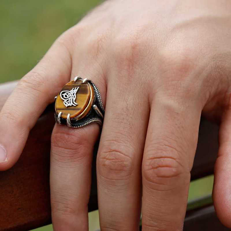 Ürün Adı: "Gümüş Kaplan Gözü Taşlı Tuğralı Erkek Yüzük"