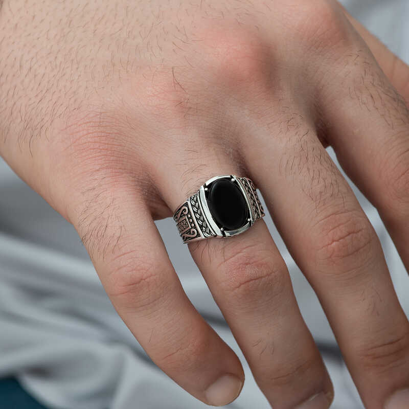 Milyonlarca yıl içerisinde yeryüzüne ulaşan oniks taşı, kayaçların ve bazı bileşenlerin ısınma ve soğumasıyla zaman içerisinde bir araya gelmesi üzerinden oluşmuş bir taştır. Oniks taşı şans taşı olarak bilinmekte olup yarı değerli bir taş türüdür. Oniks, işlenebilir olması ve estetik olarak şık durması sebebiyle eski çağlardan günümüze dek çeşitli süs eşyaları ve takıların yapımında kullanılmıştır. Oniks taşı toprak grubu burçları olan Boğa, Başak ve Oğlak’ın kutsal taşıdır. Bu burca sahip kişiler oniks taşlı aksesuarları tercih ederek negatif enerjiden korunabilirler. Bu şık yüzüğü; kendinize ya da sevdiklerinize doğum gününde, babalar gününde ve diğer özel günlerde hediye edebilirsiniz. Bu şık yüzük 925 ayar gümüşten imal edilmiştir. Gümüş üzerine oksit kaplama yapılmıştır. Oksit kaplama yapılan yüzükler otantik bir görünüme kavuşur. Tüm erkek yüzüklerde olduğu gibi gümüş oniks taşlı örgü desenli erkek yüzük modeli de el emeği ile üretilmiştir. Gümüş ve değerli taşlar nedeniyle belirtilen ortalama ürün ağırlığında ± %10 sapma olabilmektedir.