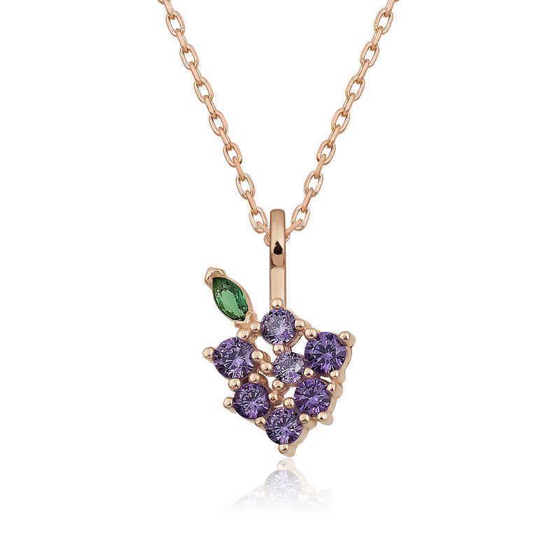 Yaz sezonunun en çok tercih edilen aksesuarları, renkli meyve konseptiyle favorileriniz arasında yer alacak. Meyve konsepti aksesuarlar yazın çok konuşulan kolyeleri olacak ve günlük stilinize renk katacak. Bu şık üzüm figür kolye; doğum günü hediyesi, sevgililer günü hediyesi veya özel günlerde tercih edilebilecek mükemmel bir seçenektir. Gümüş zirkon taşlı üzüm figür meyve kolye 925 ayar gümüşten imal edilmiştir. Bu kolye üzerine rose altın kaplama yapılmıştır. Rose altın kaplama yapılan ürünler parlaklığını uzun süre muhafaza eder, oksitlenmesini geciktirir. Tüm gümüş bayan kolye modellerinde olduğu gibi gümüş üzüm figürlü meyve kolye modeli de el emeği ile üretilmiştir. Gümüş ve değerli taşlar nedeniyle belirtilen ortalama ürün ağırlığında ± %10 sapma olabilmektedir.