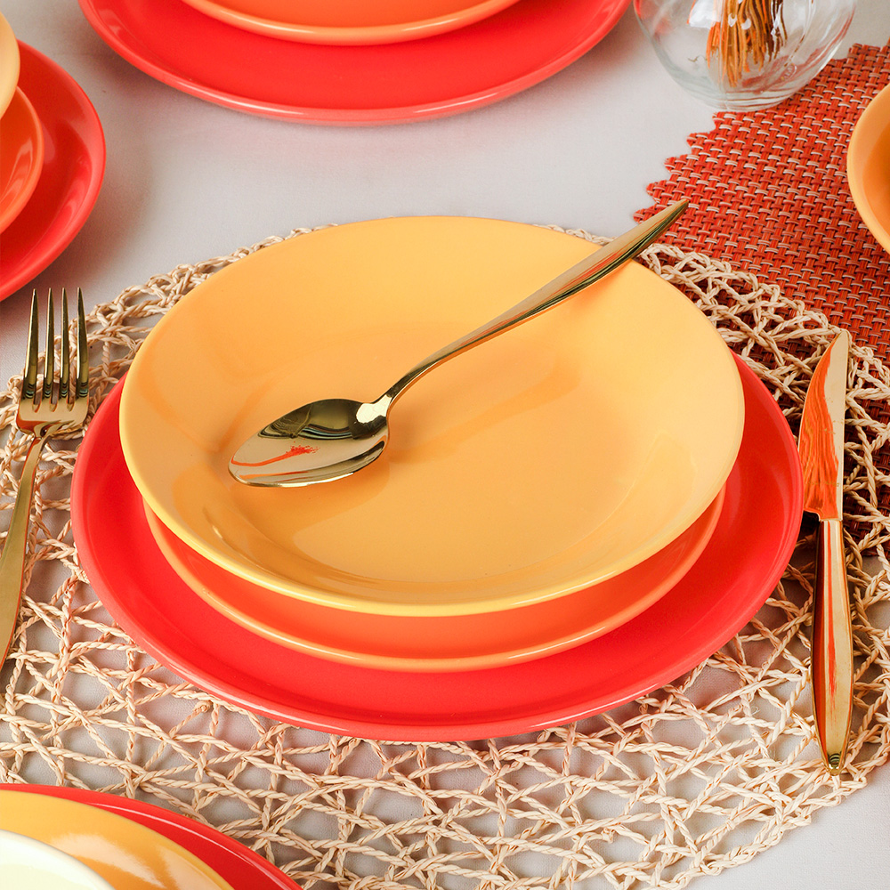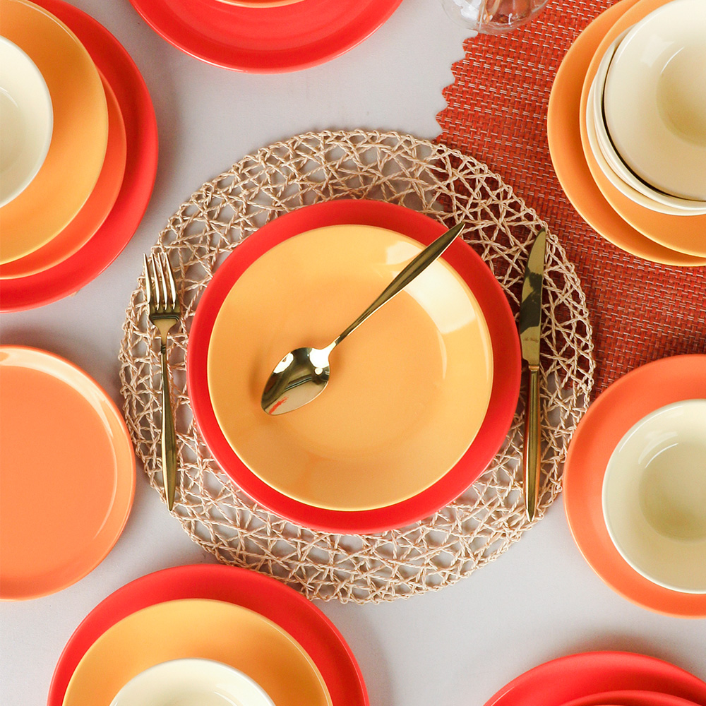 Modern formlar ile tasarlanan keramika 6 kişilik degrade turuncu hitit yemek takımı, usta ellerle şekillenerek özenle üretilmiştir. Turuncu tonlarının sakinleştirici zerafetini ve hititin kullanışlı yapısını kahvaltılarınızda, şık akşam yemeklerinizde kullanabilirsiniz. Sevdiklerinizi değerli hissettirecek bu yemek takımını zarif bir hediye olarak da tercih edebilirsiniz.