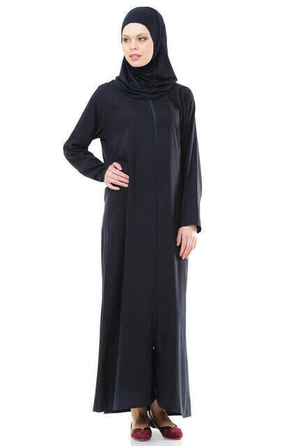 Özellikle çalışan bayan kesimin iş yerlerinde kıyafetlerinin üzerine geçirebilecekleri, önden fermuarlı ve başka bir örtü aramalarına gerek bıraktırmayacak, kendinden dikişli, örtülü namaz elbisesi modelidir. Hem hafiftir her yere taşınabilir, hem kullanışlıdır. Lacivert rengin asaletinden zarif bir namaz elbisesidir. Pamuklu viskon kumaştan dikilmiştir.