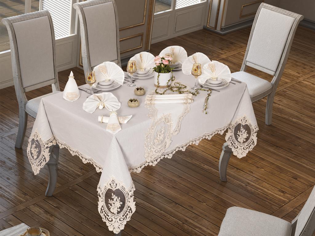 Masa Örtüsünün Dört Çevresi ve Runner uçları Fransız Taşlı Güpürleri ile süslenerek özel bir tasarım oluşturulmuştur.
