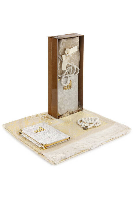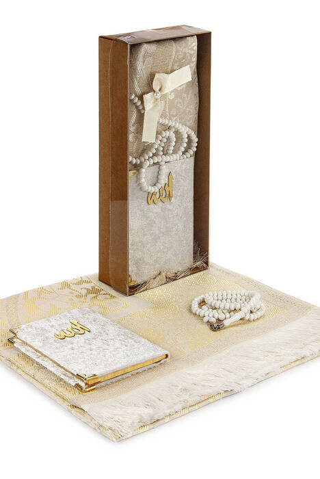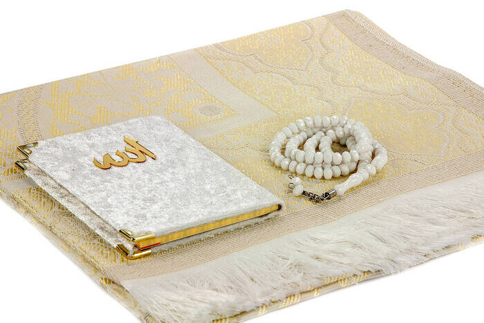 Ürün Adı: "Kraft Kutulu Seccade Seti - Kadife Kaplı Yasin - Seccade - Tesbih - Beyaz Renk"