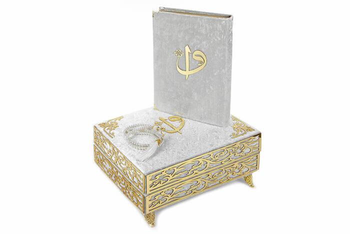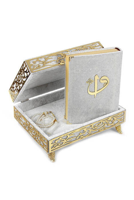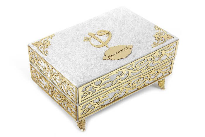Ürün Adı: "Özel Elif Vav Pleksi Süslemeli Hediyelik Kadife Kaplı Ayaklı Sandıklı Kuranı Kerim Beyaz"