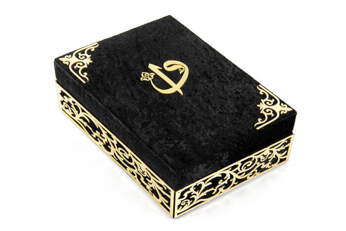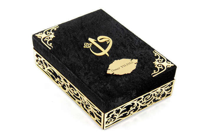 Ürün Adı: "Özel Elif Vav Pleksi Süslemeli Hediyelik Kadife Kaplı Kutulu Kuranı Kerim Siyah"