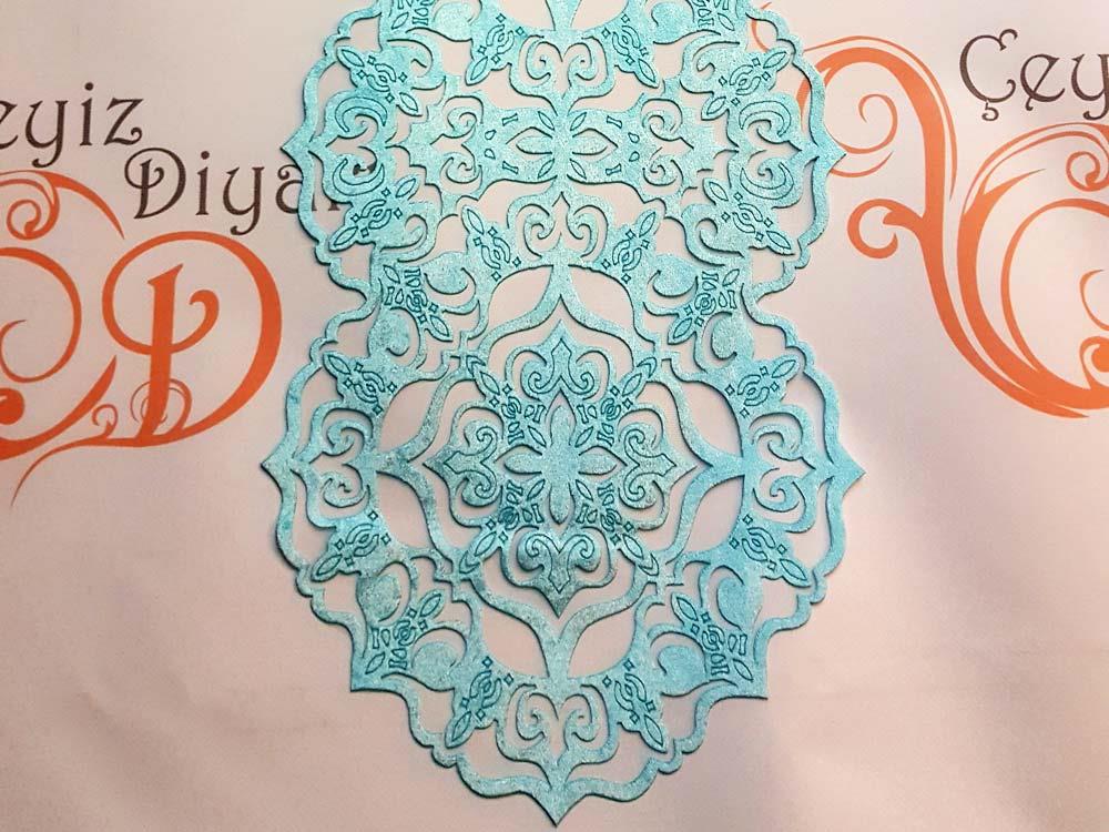 Organze Tül Üzerinde Kadife Kumaş mevcuttur. Kadife Kumaş üzerinde lazer ile işlenmiş ince ayrıntı ve detaylar ile özelleştirilmiştir.