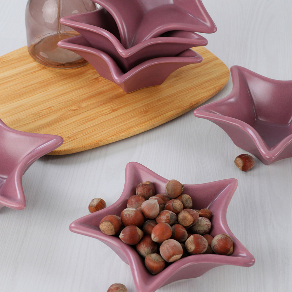 Sade bir aile yemeği veya kalabalık bir partide sizlere eşlik edecek keramika 6 adet mat violet yıldız çerezlik/sosluk servislerinize çok şık bir hava katacaktır. Gözalıcı sunumlar yapmanızın püf noktası olacak bu ürünler, masanıza havalı bir görünüm kazandıracaktır.