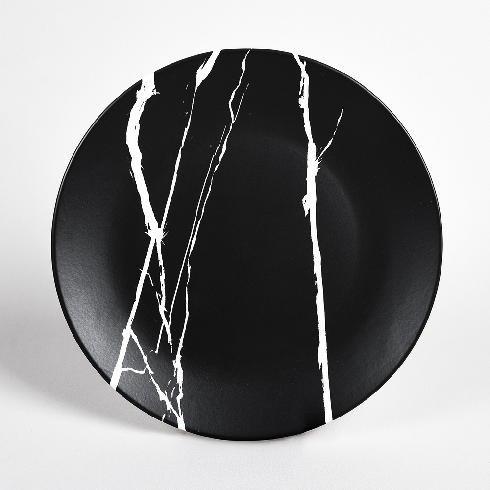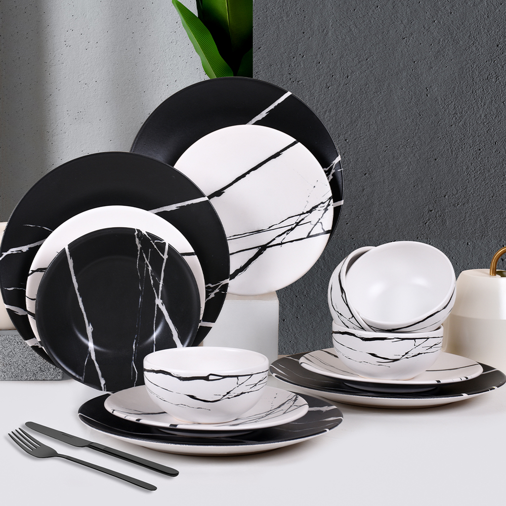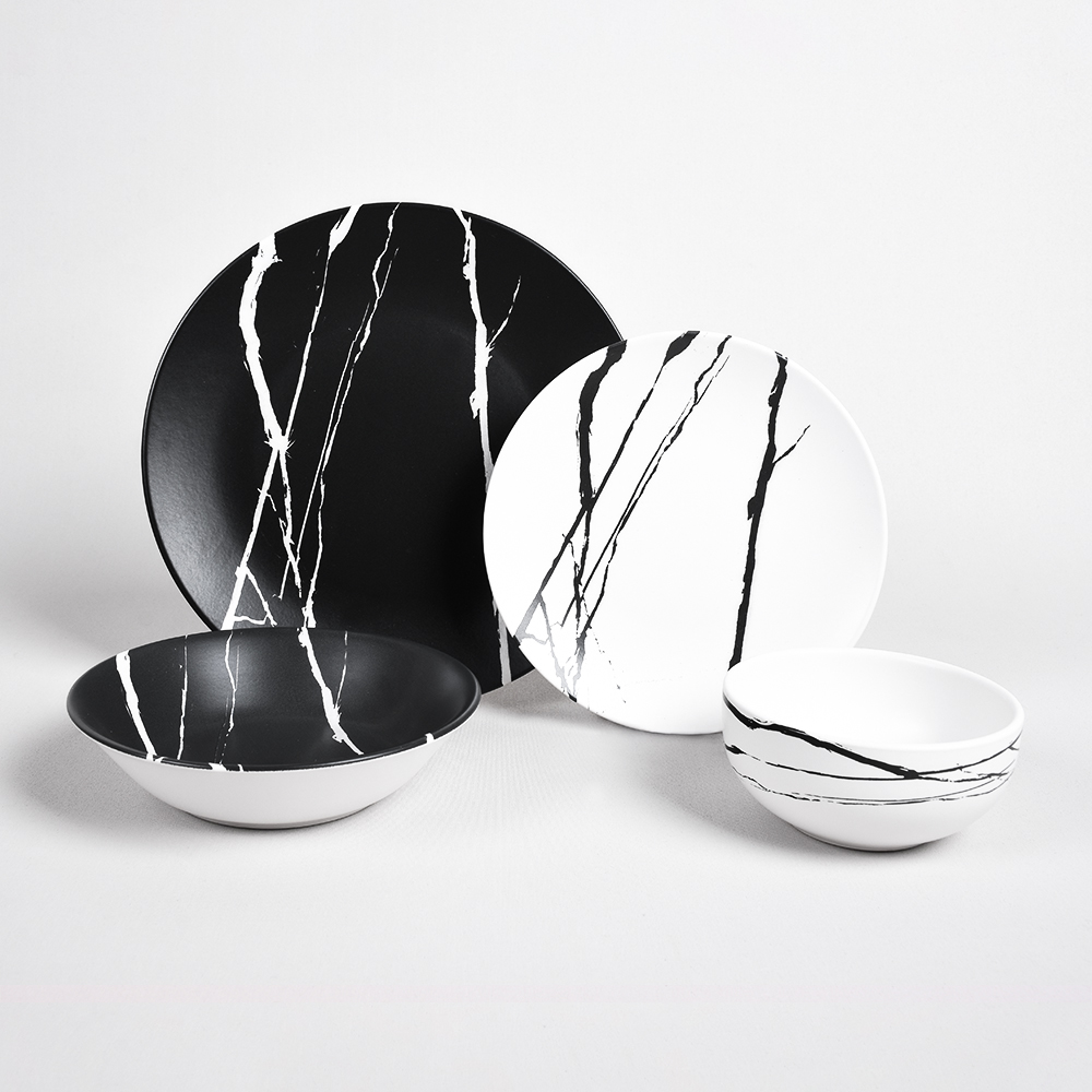 Dekorasyonun ince dokunuşlarıyla tasarlanan keramika 6 kişilik siyah beyaz mermer yemek takımı, sofranızı birbirleriyle zıt görünen ama uyum halinde olan iki rengin asaleti ile donatacak. Usta ellerin ince dokunuşlarıyla verilen mermer deseni, zarif ve sade yapısı ile sofranızda kendini gösterecek. Şıklığı ile göz kamaştıran bu yemek takımını sevdiklerinize hediye olarak göz önünde bulundurabilirsiniz.