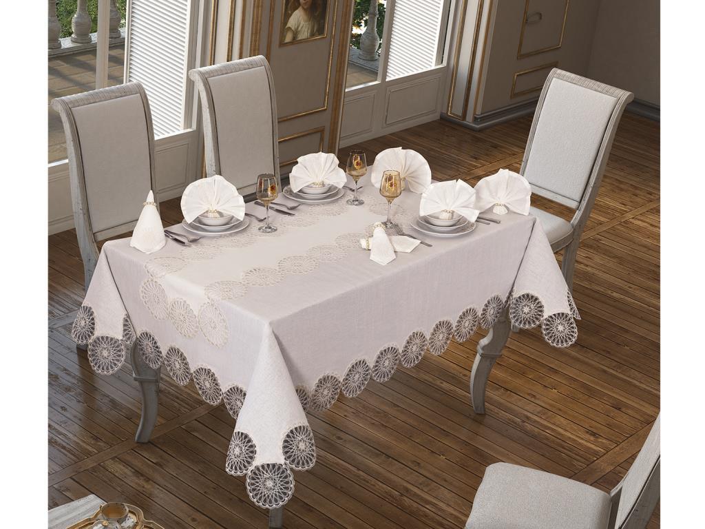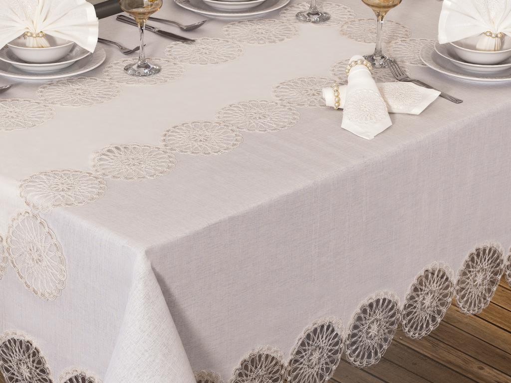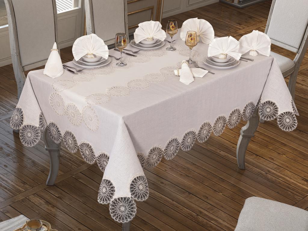 Leke Tutmaz Etuval Linen Kumaştan Kumaştan Üretilmiştir. Masa Örtüsünün Dört Çevresi ve Runner uçları Fransız Taşlı Güpürleri ile süslenerek özel bir tasarım oluşturulmuştur.
