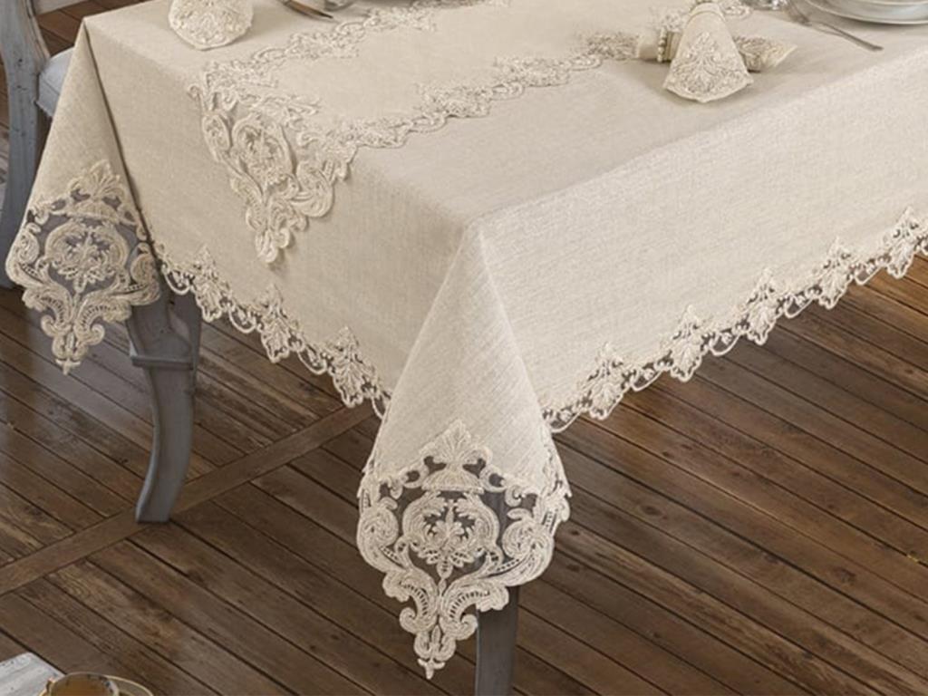 Masa Örtüsünün Dört Çevresi ve Runner uçları Fransız Taşlı Güpürleri ile süslenerek özel bir tasarım oluşturulmuştur.