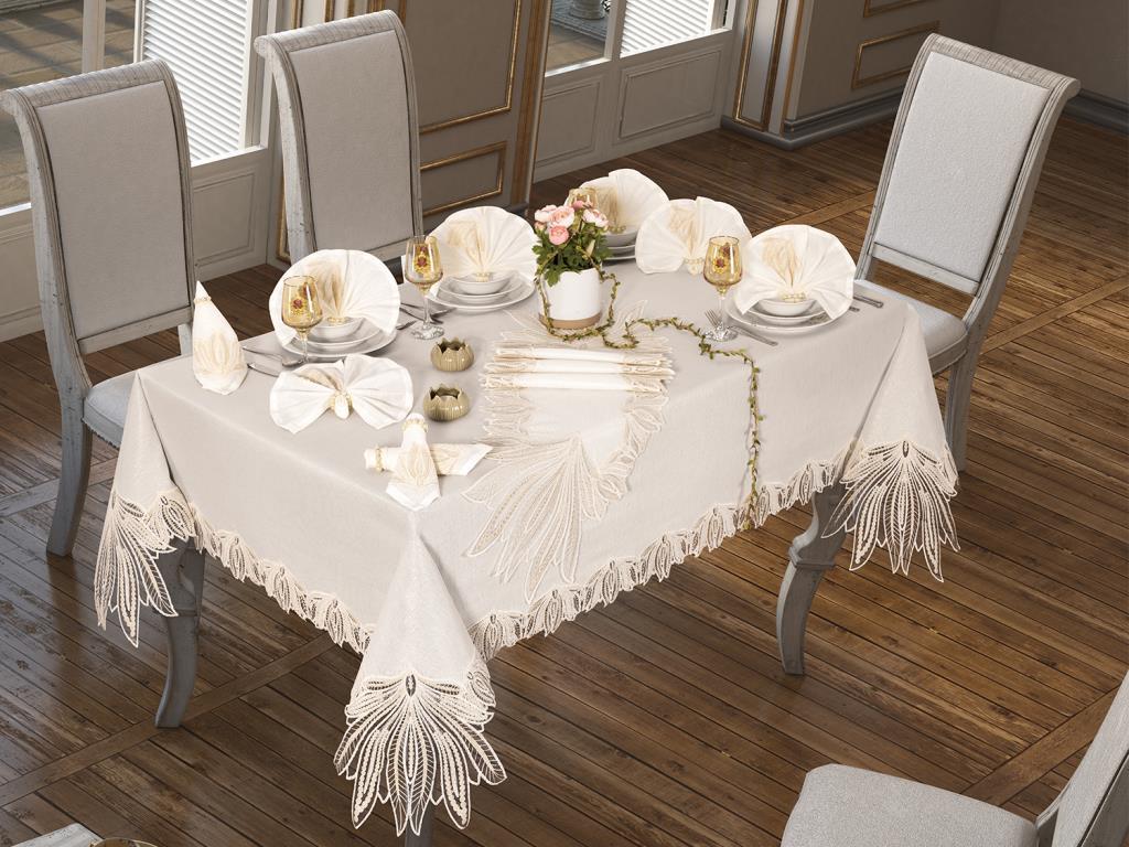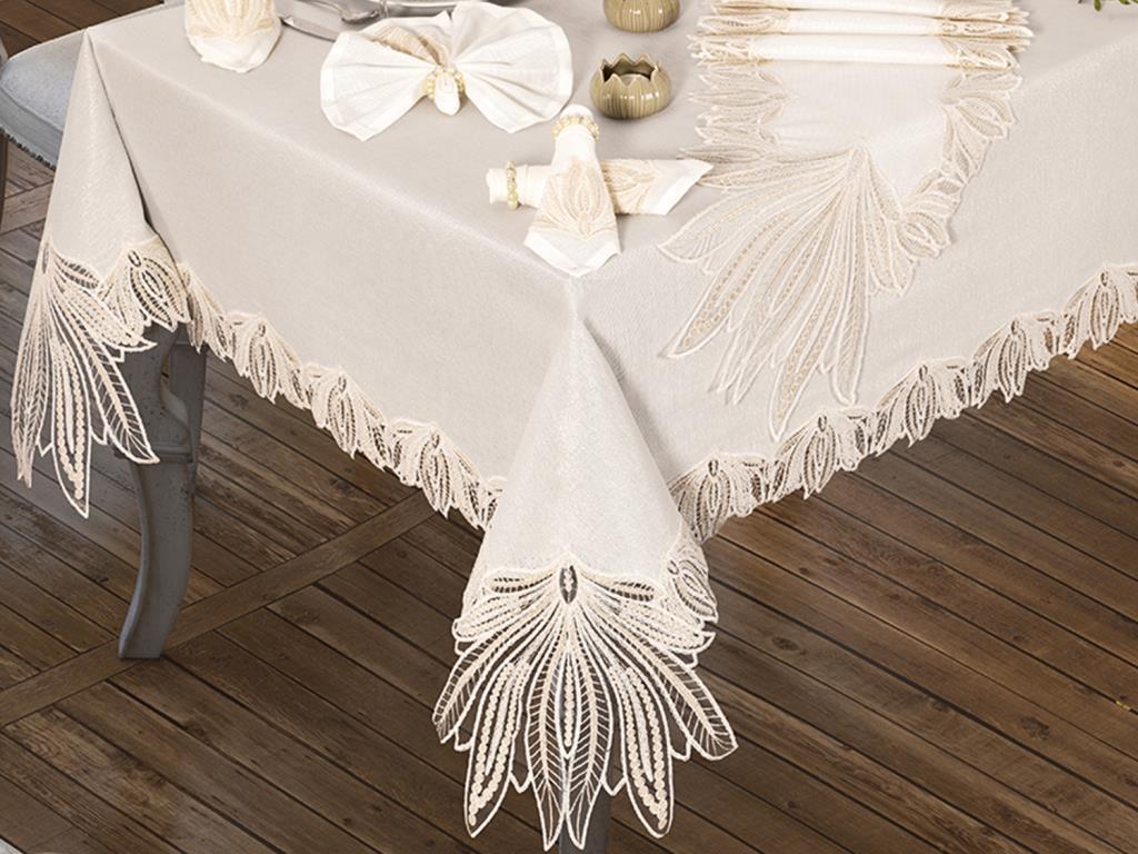 Masa Örtüsünün Dört Çevresi ve Runner uçları Fransız Taşlı Güpürleri ile süslenerek özel bir tasarım oluşturulmuştur.