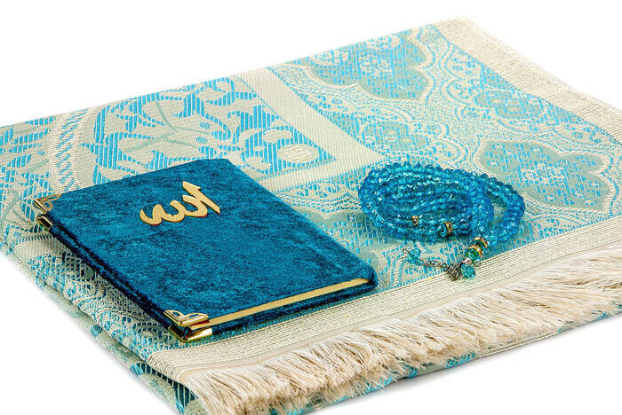 PVC Kutulu Seccade Seti - Kadife Kaplı Yasin - Seccade - Tesbih - Petrol Renk