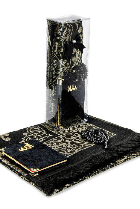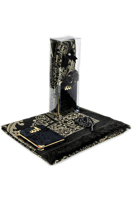 Ürün Adı: "PVC Kutulu Seccade Seti - Kadife Kaplı Yasin - Seccade - Tesbih - Siyah Renk"