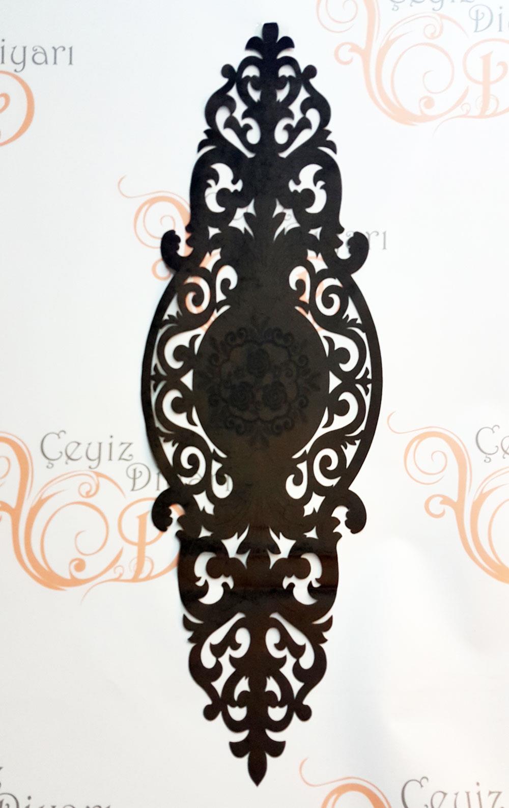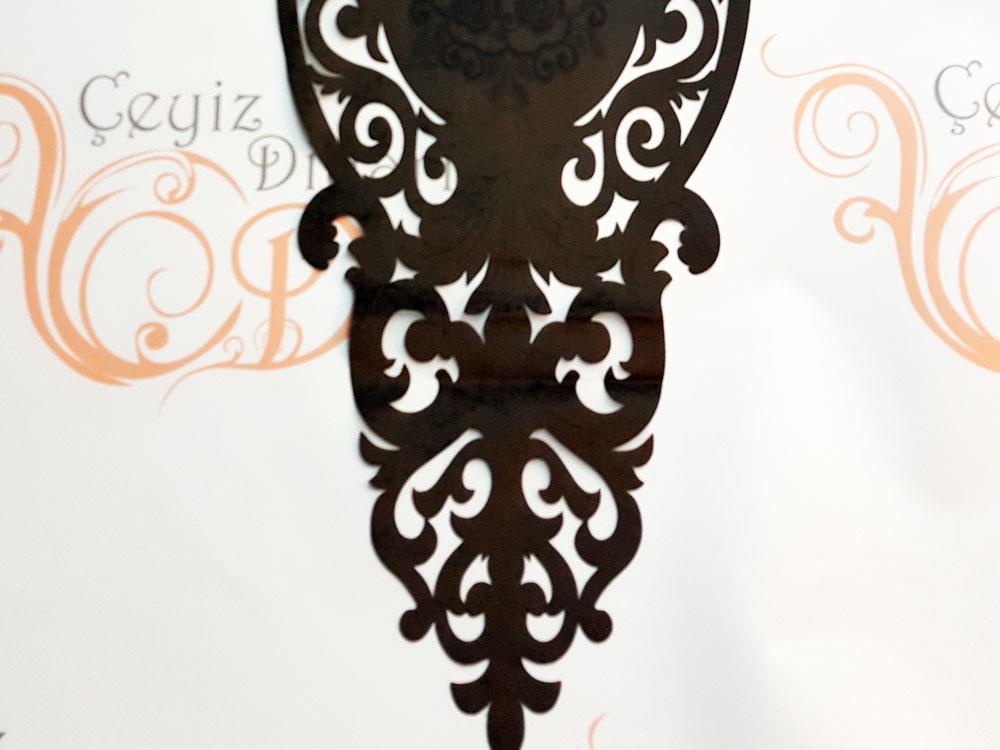 Organze Tül Üzerinde Kadife Kumaş mevcuttur. Kadife Kumaş üzerinde lazer ile işlenmiş ince ayrıntı ve detaylar ile özelleştirilmiştir.