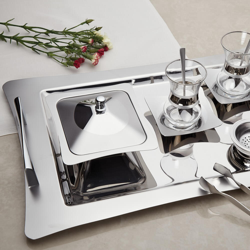 Zarif Sedir saten çay takımını hem günlük çay sohbetlerinizde hem de davet sofralarınızda kullanabilirsiniz. Tepsisinin mat görünümlü saten yüzeyi ve ayna gibi parlak çeliği ilham veren sunumlarınız için ideal. Sedir saten çay takımının tüm parçaları bulaşık makinesinde yıkanabilir.