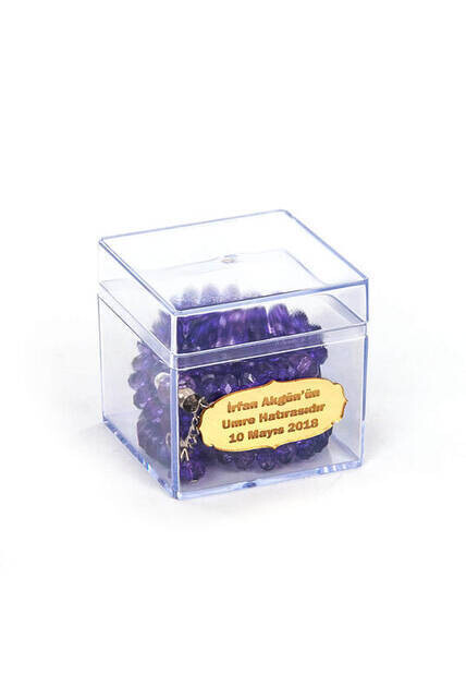 Ürün Adı: "Şeffaf Plastik Kutulu, 99'lu Kristal Hac Umre Hediyelik Tesbih Mor İsme Özel Plakalı"