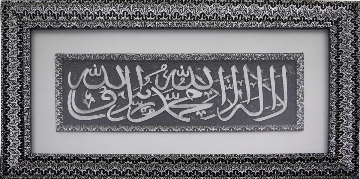 التسليم: 1 × دكونز تصوير ديني كبير مكتوب "كلمة التوحيد" مجسمة | أسود  فضة | 115×64سم