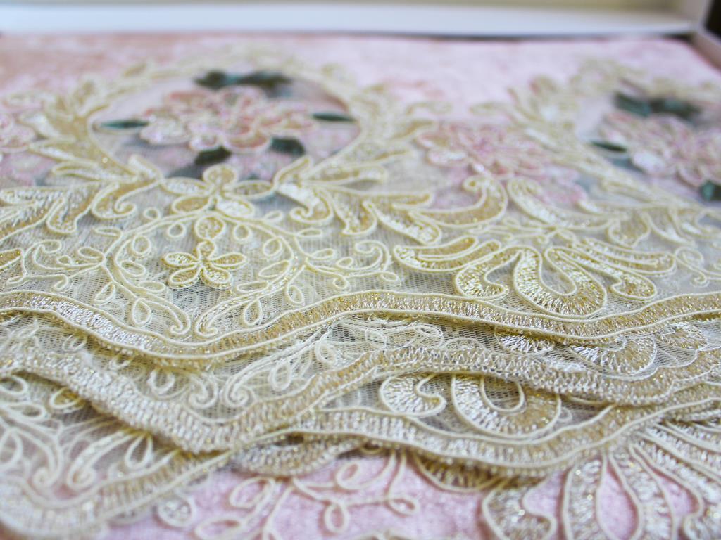 تم ابتكار تصميم خاص ليتم حياكته على الجوانب الأربعة من مفرش المائدة بطريقة نحت الدانتيل الفرنسي.