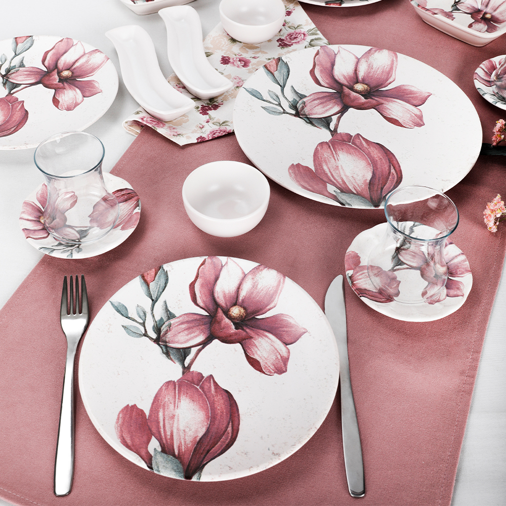 مجموعة إفطار كيراميكا الوردية المكونة من 4 أشخاص بزخارف نباتية بسيطة مصممة بعناية لتقديم عروض تقديمية أنيقة. مجموعة الإفطار المكونة من أنماط الأزهار ستثير شهية عائلتك وضيوفك في العروض التقديمية! يمكنك اختيار مجموعة الإفطار الخاصة هذه كهدية خاصة أو تقديم وجبة إفطار لطيفة يوم الأحد.