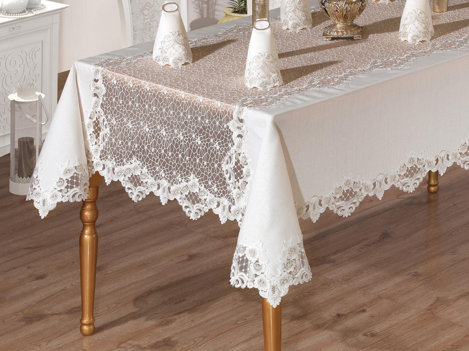 يتم إنشاء تصميم أنيق من خلال وضع مفرش المائدة الدانتيل الفرنسي على 4 جوانب.