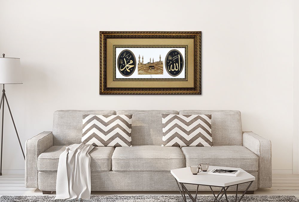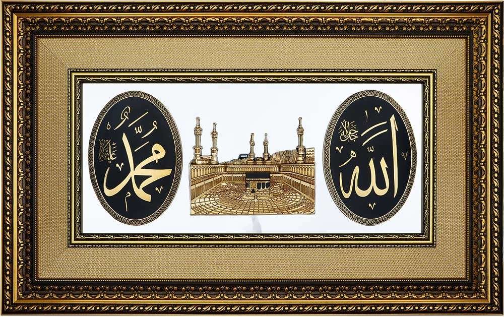 التسليم: 1 × المينا تصوير ديني الزخرفي ثلاثية الأبعاد كبيرة "الله محمد كعبة" | الذهب - 58×95سم