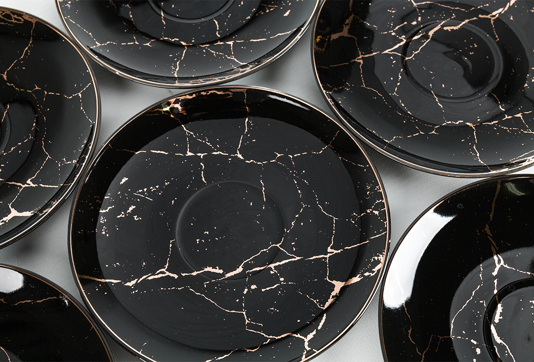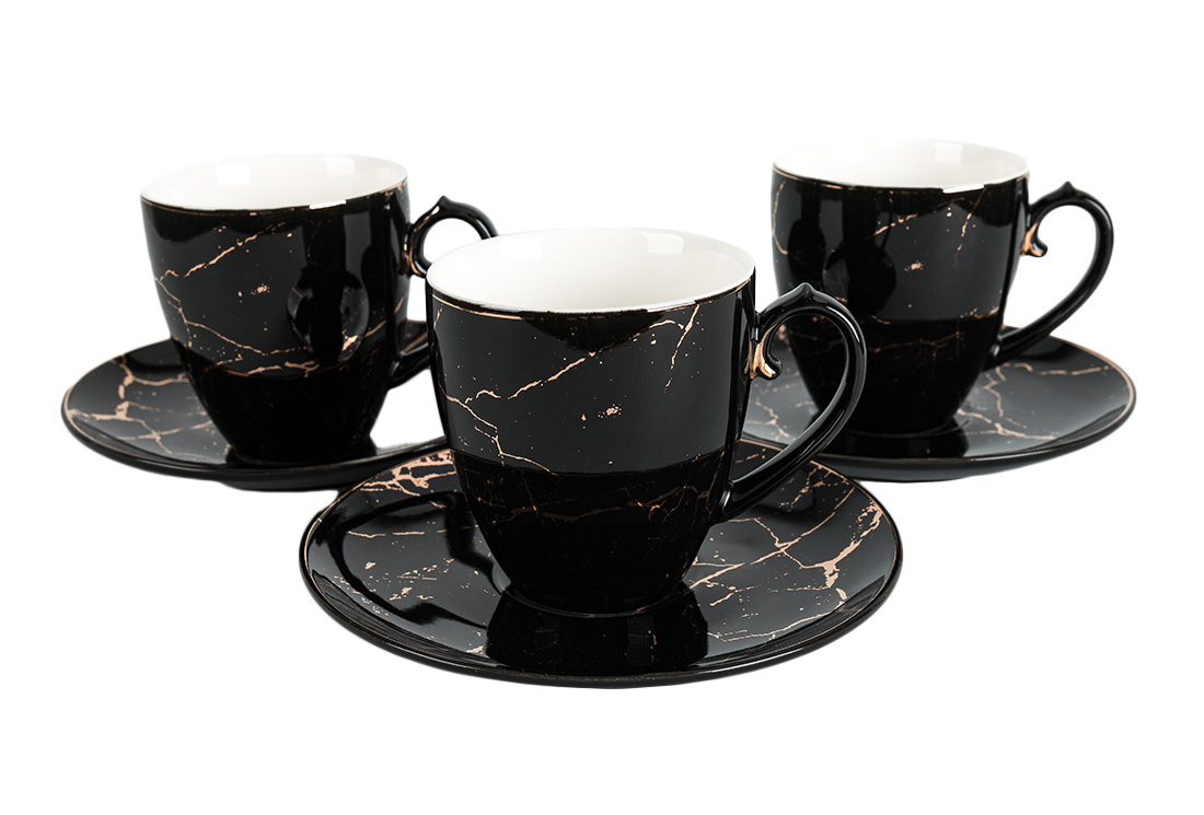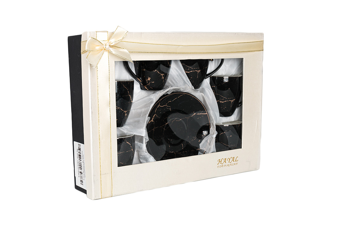 التسليم والأبعاد : 1x الحلم | طقم فناجين قهوة | 6 أشخاص | 12 قطعة | منقوشة رخامية | الذهب الأسود | By-alzp-180430-أسود