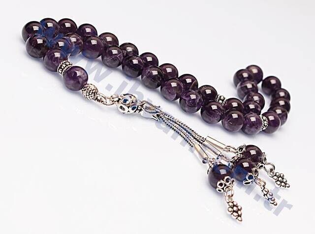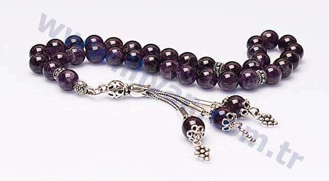 Bu ametist doğal taş tesbih ametist taşının en güzel tonlarından özel olarak şeçilerek üretilmiştir. Bu orjinal ametist taşından üretilmiş olan tesbihin püskülü, imameleri, ayracı hiçbir yerde bulamıyacağınız model ve tasarımda olup, bu ametist tesbihler firmamızın bizzat tasarladığı modelde üretilmiştir. Ürünlerimizde orijinal doğal taşların yanı sıra estetikliğini arttırmak amacıyla bazı süsleme tesbih aparatları kullanılmış ve ürünlerin estetik görünümleri arttırılmıştır. Ayrıca orjinal ametist taşı tesbihlerimiz firmamızın özel olarak üretmiş olduğu doğal taş tesbihlerde ip kesme problemini ortadan kaldırmak için kullanılan kopma ve dağılmalara karşı dayanıklı, kopmayan taş ipi olan elastik misina tarzı özel lastik ipe dizilmiştir. Normal kullanımda bu ip oldukça dayanıklı esnek ve uzun ömürlüdür. Bu özellikleriyle ürünlerimizi ip kopması, tesbih dağılması gibi problemleri yaşamadan rahatlıkla uzun süreler kullanabilirsiniz. Ayrıca bu özel ipin esnek elastik yapısı itibarı ile tesbihimiz her bileğe rahatlıkla geçmekte ve böylece zaman zamanda tesbihi bileğinize takarak bileklik olarak da kullanabilirsiniz. Sizlerede özel tasarım ve dayanıklı özel ipiyle üretilmiş, ametist taşı tesbih satın almanızı tavsiye ederiz. Ayrıca ametist taşlı tesbih fiyatları da toptan fiyatına yakın uygun fiyattatır. Bu doğal taş tesbihleri hem sallamak hemde stres atmak için çekerek kullanabilirsiniz. Ayrıca bu tesbihlerin tane sayısı 33 olduğundan bu tesbihleri zikir çekmek amaçlı veya namazlarda tesbih çekmek amaçlı da kullanabilirsiniz. Çok amaçlı kullanabileceğiniz bu tesbihleri aynı zamanda muhteşem enerji ve faydalarından yararlanabilmek için de kullanabilirsiniz. Bu ürün orijinal ametist taşından üretildiği için ametist taşının şu psikolojik ve fiziksel faydalara sahiptir ; Ametist taşı aşk ve sevgi taşı olarak bilinmektedir. Negatif elektrik yükünü topladığından ve taşıdığından bedendeki fazla elektrik yükünü toplayarak beyin gücünü yükseltici etkileri tespit edilmiştir. Topladığı negatif elektrik yükünü pozitif elektrik yüküne çevirir. Depresyona karşı iyi gelir. Şifa bakımından en güçlü taşlardan olan ametist taşı cilt rahatsızlıklarına, alerjik, migren, baş ağrılarına ve kalp rahatsızlıklarına şifalıdır. Uykusuzluk çekenlerin uykusuzluklarına faydalıdır. Ametist taşı enerji dolu bir taşdır. Bulundurduğu bu enerjiyle taşı üzerinde taşıyan kişiyi canlandırırcı etkisi vardır. Üzerinizde rahatca sürekli taşıyabileceginiz bir taşdır. Ametist taşı 'nın çevreye yaydığı enerji faydalıdır ve olumsuzluklardan kişiyi kurtarır. Ametist taşı 'nın özellikle düşman gördüğünüz kişilerin yanındayken üzerinizde bulundurmanız faydalıdır. Çünkü ametist taşı olumsuz enerjileri pozitif enerjiye çevireceğinden ortamdaki kötü niyetli kişilerinde düşüncelerini olumlu yapar. Enerjisi huzur vericidir ve sinir sistemine iyi gelir. Kişiye iç huzur verir. Kararsızlıkdan kurtarır ve kararlarımızı netleşdirir. Uykusuzluk çeken kişiler uykudan önce bir müddet ametist taşını elinizde tutun ve yattığınız yastığın altına koyun ve yatın. Ametist taşı eklem ağrılarına, kan dolaşımına faydalıdır. Vücudu zararlı toksinlerden arındırır ve kişiyi hayata daha sağlıklı yönlendirir. Pembe kuvarsla kullanıldığında aklı güçlendirdiği ve kalbe iyi geldiği bilinir. Tendeki hücrelerin yenilenmesini saglar ve teni güzelleşdirdiği çalışmalarla tespit edilmiştir. Kişiyi sapkın düşüncelerden kurtarır. Kanser oluşumu engellediği bilinir. Kişinin yapacakların odaklanmasına konsantre olmasına yardımcı olur. Bağışıklık sistemini güçlendirir, kanı temizler.
