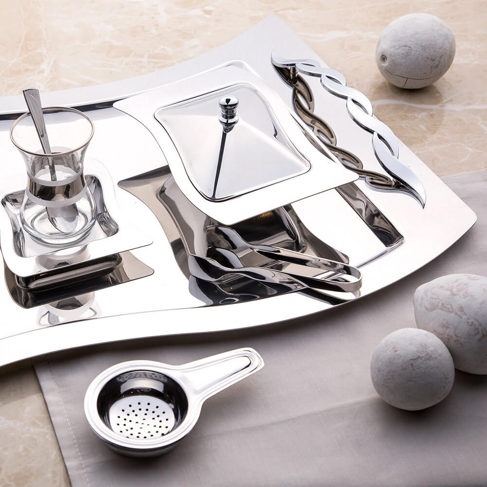 يمكنك استخدام طقم شاي باشاك الأنيق في محادثات الشاي اليومية وعلى طاولات الدعوة. يُعد السطح المصقول غير اللامع للصينية المتموجة والفولاذ اللامع مثل المرآة مثالية لعروضك التقديمية الملهمة. يمكن غسل جميع أجزاء طقم شاي باشاك في غسالة الأطباق.