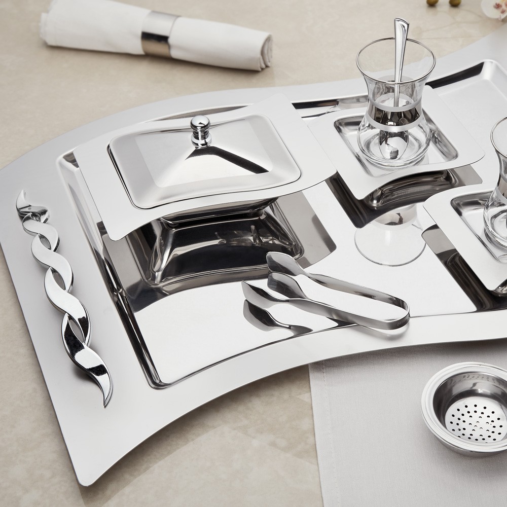 يمكنك استخدام طقم شاي باشاك الأنيق في محادثات الشاي اليومية وعلى طاولات الدعوة. يُعد السطح المصقول غير اللامع للصينية المتموجة والفولاذ اللامع مثل المرآة مثالية لعروضك التقديمية الملهمة. يمكن غسل جميع أجزاء طقم شاي باشاك الساتان في غسالة الأطباق.