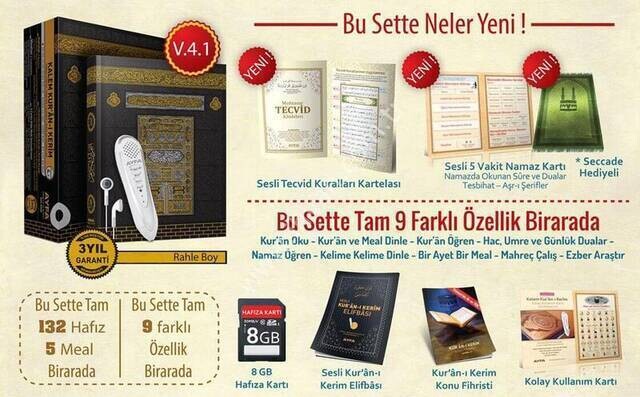 - Kutu içerisinde bulunan kolay kullanım kılavuzu ve kartela sayesinde Kur’ân-ı Kerim yanınızda olmasa dahi;