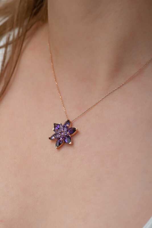 Lotus Çiçeği, ruhsallığı, maneviyatı ve temizliği simgeleyen en hoş çiçeklerin başında gelir. Yağmur ormanlarının kirli sularında çiçek açan lotus çiçeği, güzelliği ve saflığı ile budizm ve hinduizm gibi inançlarında sembolü olmayı başarabilmiştir. Bununla birlikte birçok eski medeniyet içinde lotus çiçeği, kutsal sayılır. Lotus çiçeğini özel kılan bir diğer detay ise çiçeğin yetiştiği bölge oluyor. Bilhassa bataklık, çamurlu arazi gibi alanlarda yetişen lotus çiçeği, yetiştiği kirli ortama rağmen temiz kalabiliyor. Üzerine konan tek bir toz zerresini bile temizleyebilen lotus çiçeği, bembeyaz bir güzellik ile karşısına çıkanları selamlıyor. Siz de farklı kültürlerde kutsal sayılan gümüş mor lotus çiçeği kolyeyi sevdiklerinize armağan edebilir ya da kendinizi ödüllendirebilirsiniz. Bu şık kolye; doğum günü hediyesi, sevgililer günü veya özel günlerde tercih edilebilecek mükemmel bir seçenektir. Kolye; 925 ayar gümüşten imal edilmiştir. Gümüş üzerine rose altın kaplama yapılmıştır. Diğer kolyelerde olduğu gibi gümüş mor lotus çiçeği kolye de el emeği ile üretilmiştir. Gümüş ve değerli taşlar nedeniyle belirtilen ortalama ürün ağırlığında ± %10 sapma olabilmektedir.