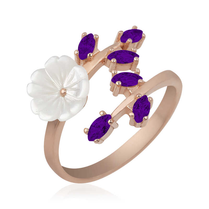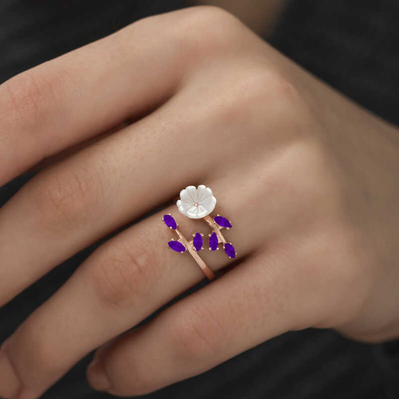 Havaların ısınmasıyla birlikte canlanan doğa, ilkbaharın geldiğini müjdeler. Yeşile bürünen ağaçlar, rengarenk çiçekler açar ve eşsiz kokuları ile bizi karşılar. Doğadan ilham alınarak tasarlanan bu yüzük yeniden doğuşu ilkbaharı sembolize etmektedir. Bu şık yüzük; doğum günü hediyesi, sevgililer günü veya özel günlerde tercih edilebilecek mükemmel bir seçenektir. Yüzük; 925 ayar gümüşten imal edilmiştir. Gümüş üzerine rose altın kaplama yapılmıştır. Rose altın kaplama yapılan ürünler gümüşe pembe bakır rengi verir. Diğer yüzüklerde olduğu gibi gümüş mor yapraklı bahar çiçeği yüzük de el emeği ile üretilmiştir. Gümüş ve değerli taşlar nedeniyle belirtilen ortalama ürün ağırlığında ± %10 sapma olabilmektedir.
