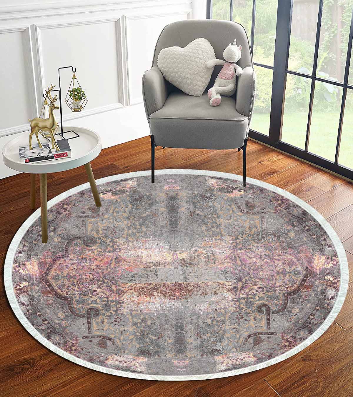 الأبعاد والتسليم: 1x بيركيليم سجادة دائرية قابلة للغسل مزخرفة بقاعدة حريرية غير قابلة للانزلاق | MLN-IP-YU-HT-953