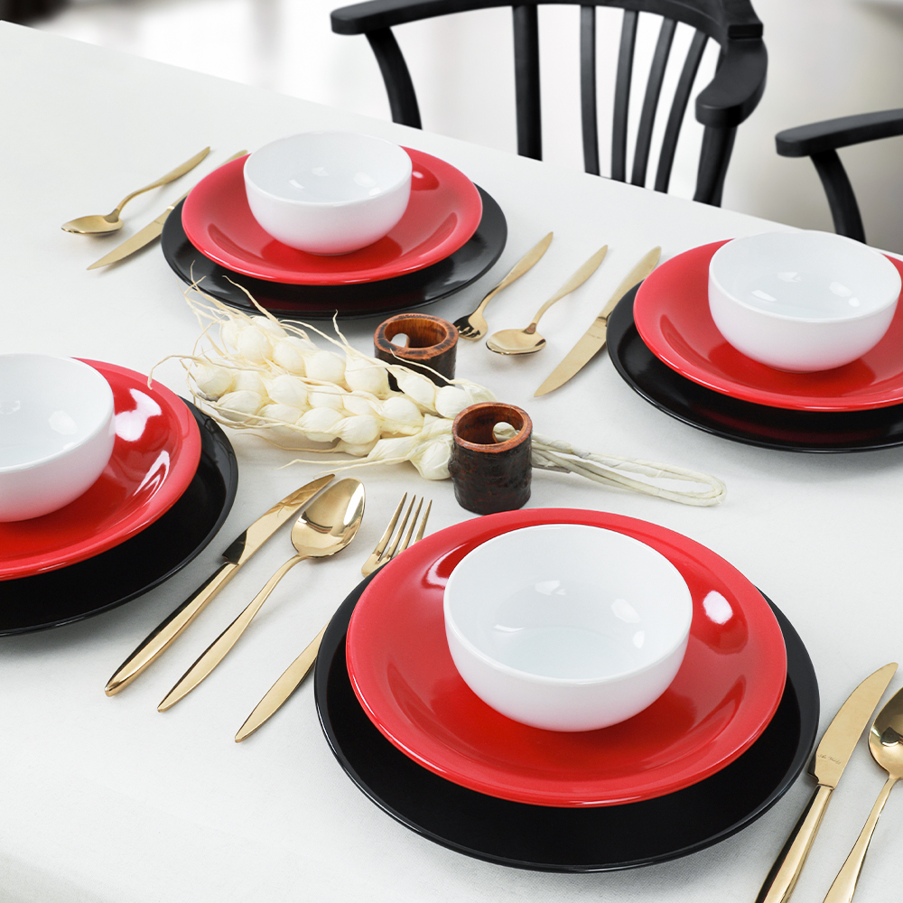 Doğanın ve baharın renkleri ile harmanlanan keramika 4 kişilik Ege Crimson yemek takımı muhteşem renk uyumu ile özenle tasarlandı. Kırmızı,siyah ve beyazın enfes uyumuyla hazırlanan bu yemek takımı ile sofralarınız harika görünecek. Sevdikleriniz için de harika bir hediye seçeneği olabilecek bu yemek takımı şıklığıyla herkesi büyüleyecektir.
